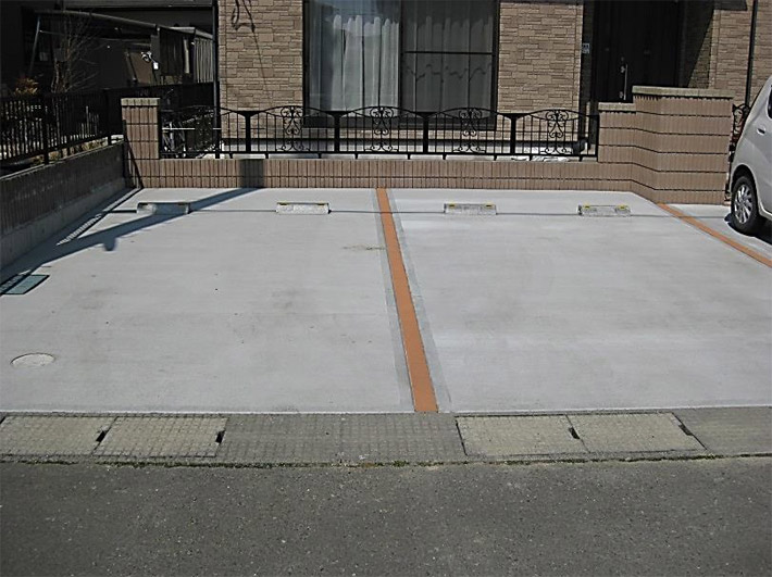 ②アフター(施工後)駐車スペース後ろ側:化粧ブロック積み+笠木&フェンス&門柱+笠木&両開き門扉(親子仕様)。駐車スペース:既存砕石敷きからコンクリート土間へ。